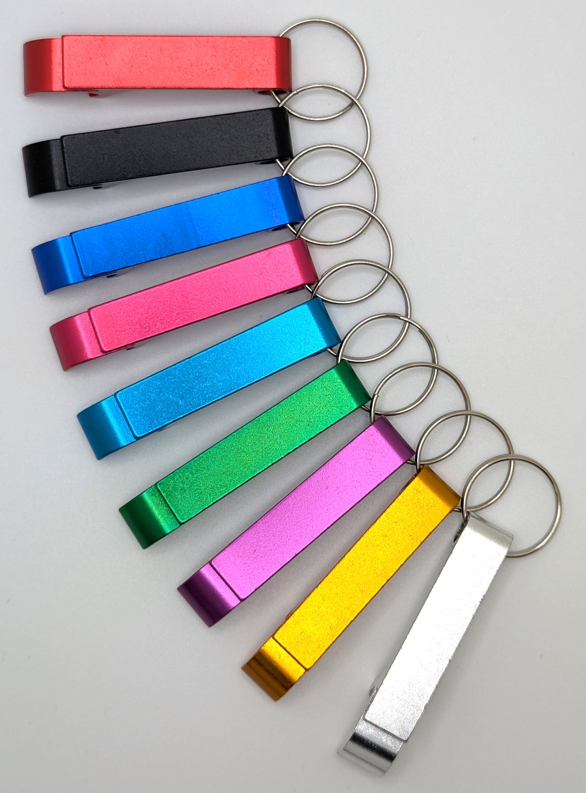 Material: Aluminum alloy metal. Weight: 10.5g/piece. Bottle Opener Keychain is small and lightweight enough to fit in your hand, your pocket, your car or even pipe case.