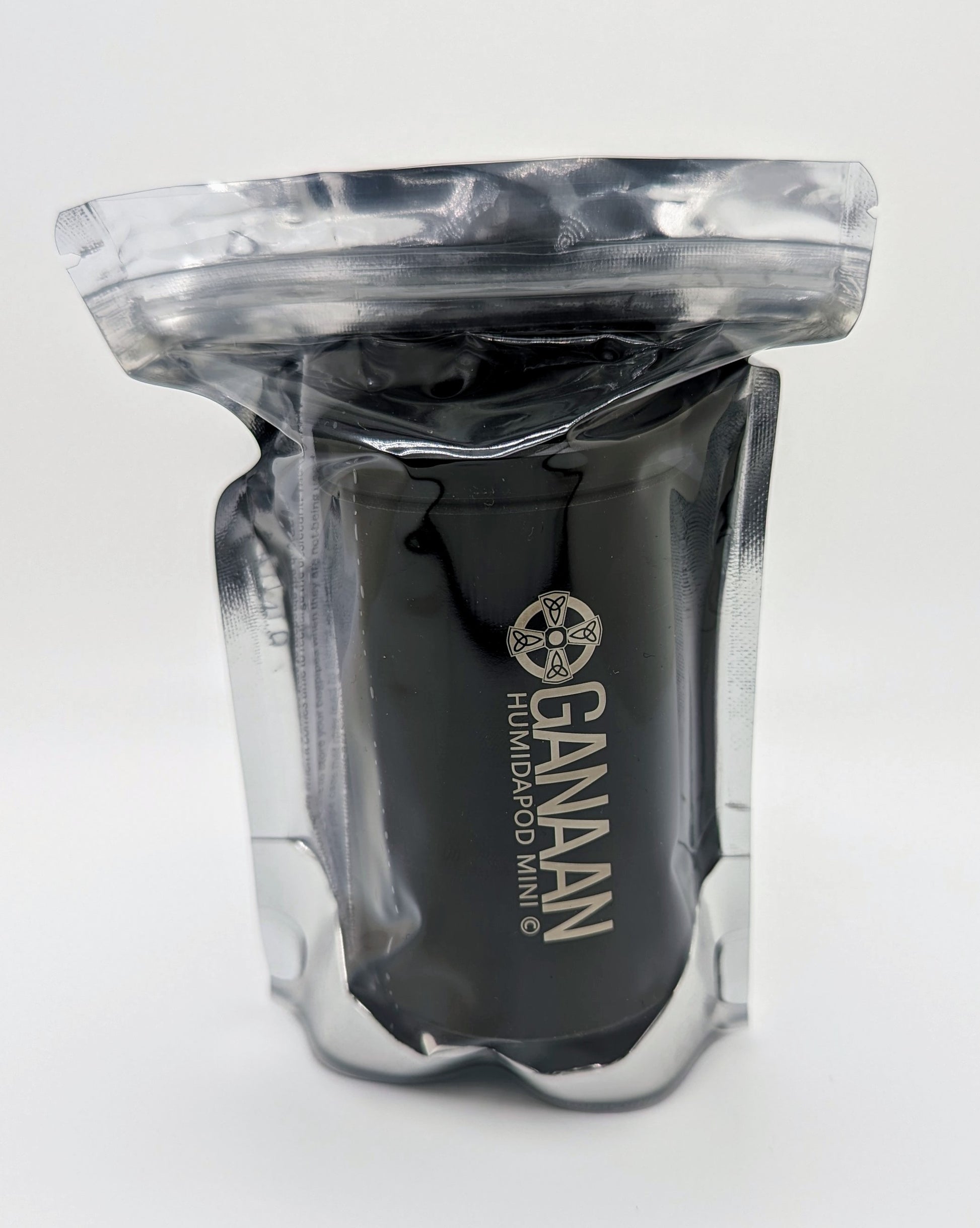 The GANAAN Humidapod Mini © is 2 inches in diameter by 3 inches long with one end that unscrews to access the desiccant. Both ends have 36 small holes in each end to allow moisture to enter. The pod will also be laser etched with GANAAN logo and product name as shown in the first image.