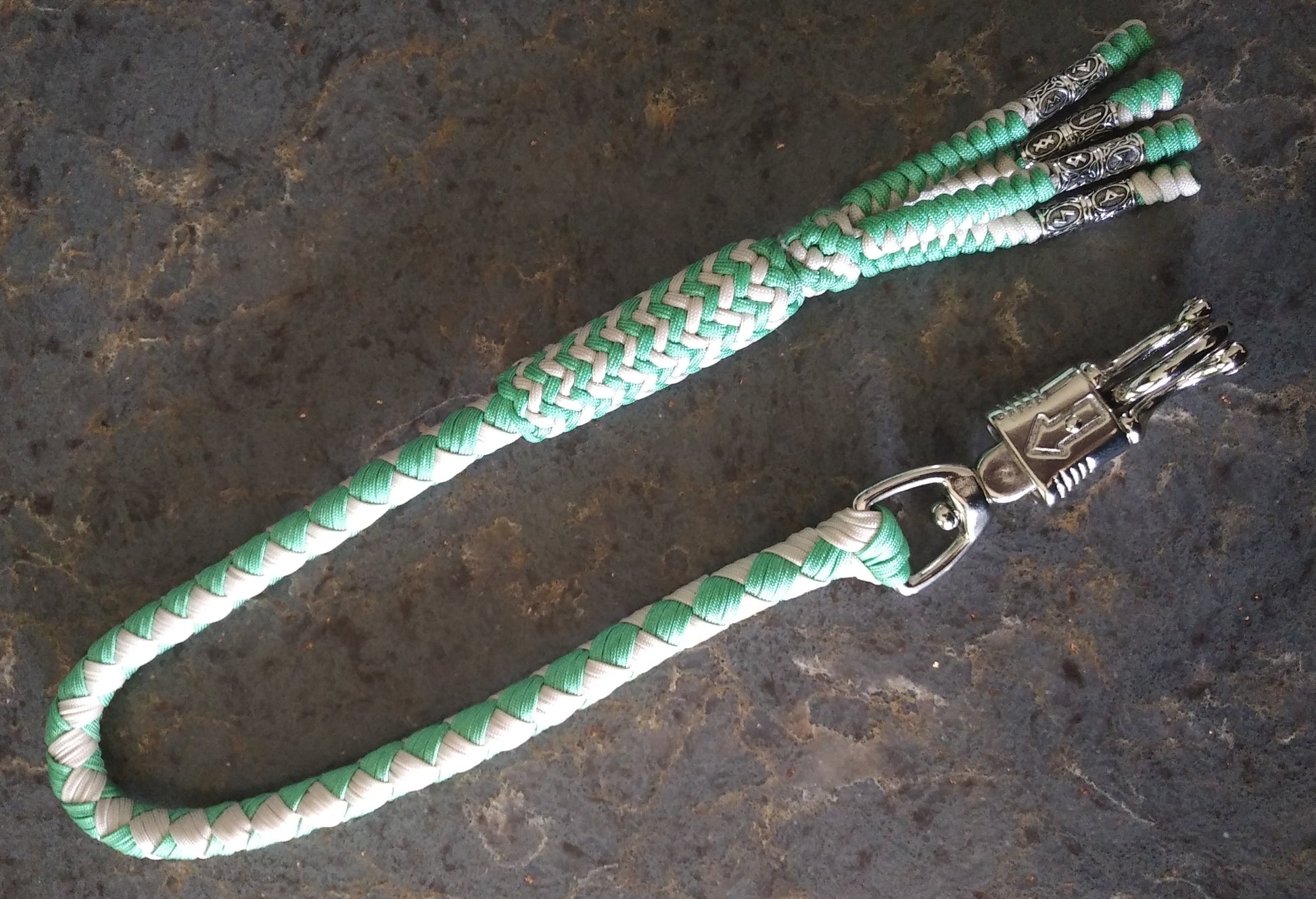 Made from 550 Paracord with almost 120 feet of paracord for each lanyard. See our blog post indicating what colors are available. Currently, lanyards are offered using only any 2 color combinations. Our paracord material is fade and UV resistant for long life.